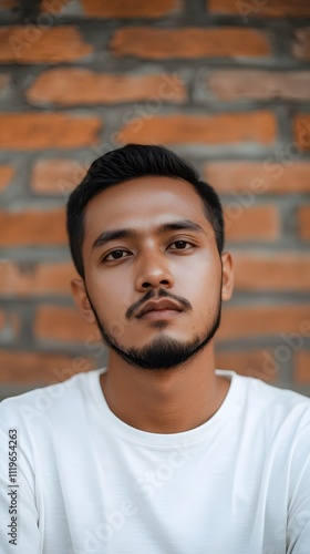 A cinematic photograph of an Indonesian man with short hair and a beard,