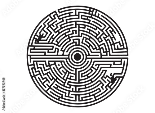A circle maze or labyrinth silhouette on a white background.
