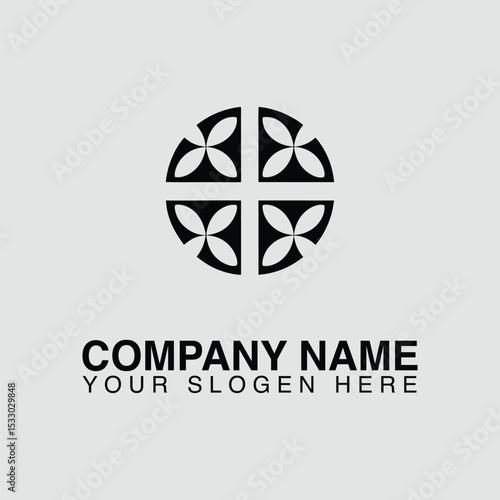 A circular emblem divided into quadrants, each containing a stylized fourpetal flower, isolated on white background