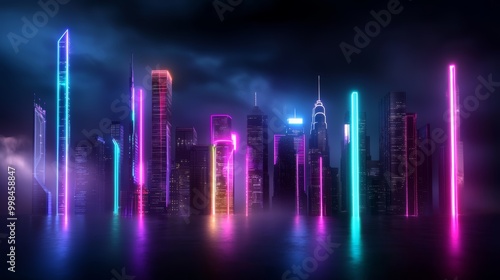 A city skyline where the outlines of buildings are illuminated by long vertical streaks of neon light, giving a sense of energy and futuristic design.