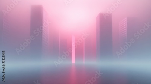 A city skyline with a pinkish hue and a foggy atmosphere