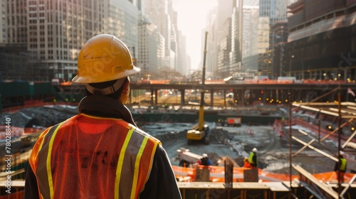 A civil engineer surveys a bustling construction site, ensuring the foundation of a future skyscraper is flawless.