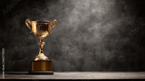 A classic gold trophy with ornate handles and intricate detailing sits on a black pedestal against a dark textured backg