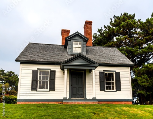 A classic small white house with black shutters and a grey roof, nestled in a green lawn with trees in the background, exuding a charming, traditional American aesthetic.