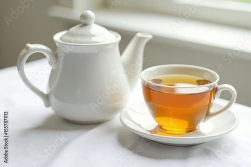 A classic white teapot and matching teacup filled with amber liquid, set on a simple white tablecloth , elegant, photography