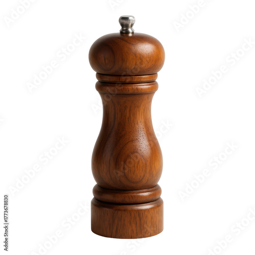 A classic wooden pepper mill with a silver top isolated on a black background. This kitchen utensil is perfect for grinding spices and adding flavor to food.
