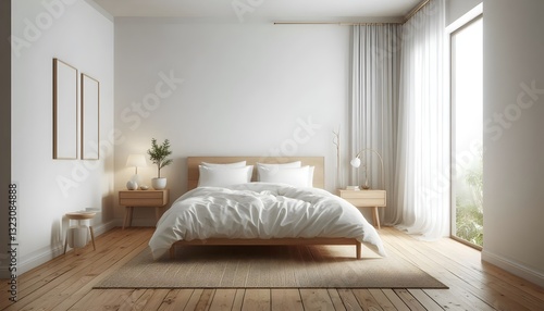 A clean and inviting bedroom features a large bed adorned with soft blankets and pillows