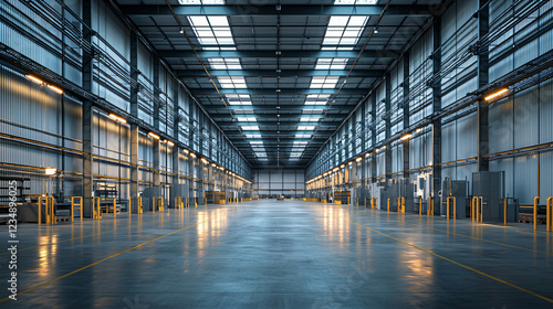 A clean and spacious distribution center with security checkpoints, motion sensors, and AI-powered surveillance ensuring safety. The modern industrial design with bright lighting creates an atmosphere