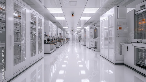 A clean, modern hallway lined with high-tech equipment and glass displays, indicative of a sophisticated laboratory or research facility.