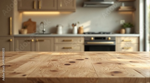A clean wooden kitchen table with a sharp focus in the foreground, with a modern minimalist kitchen faintly visible in the background.