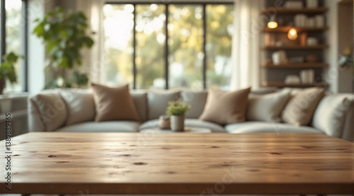 A clean wooden table is in sharp focus in the foreground, with a cozy, modern and minimalist living room faintly visible in the background.