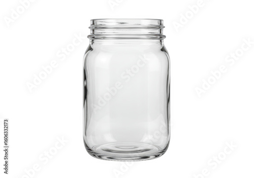 A clear empty glass mason jar with a threaded rim isolated on a transparent background ready for use