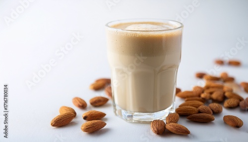 a clear glass filled with a creamy almond latte sits on a pristine white background milk food styling breakfast