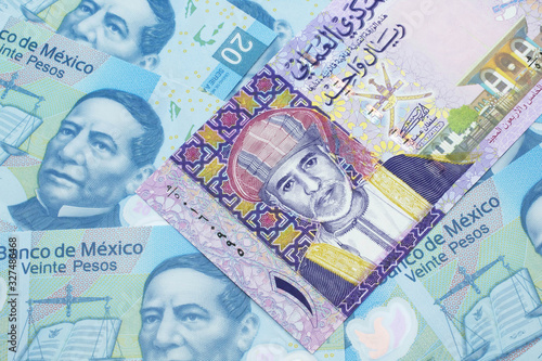 A close up image of a colorful one rial bank note from Oman on a bed of Mexican twenty peso bank notes in macro