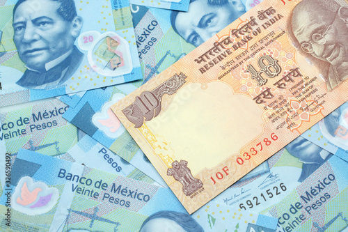 A close up image, shot in macro, of an orange, ten rupee Indian bank note on a bed of blue, twenty Mexican peso bills