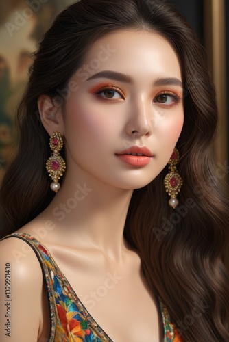 a close up of a woman with long hair wearing earrings