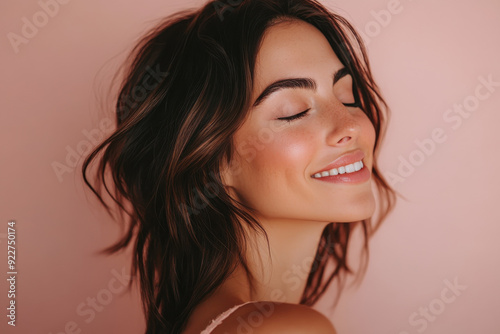 A close up of a woman's face with her eyes closed