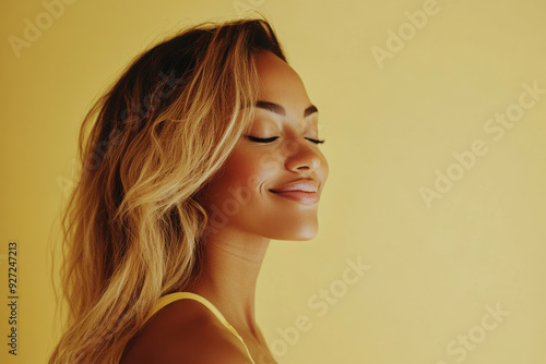 A close up of a woman's face with her eyes closed and long blond hair