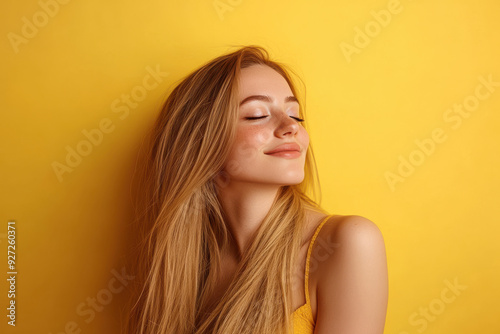 A close up of a woman's face with her eyes closed and long blond hair
