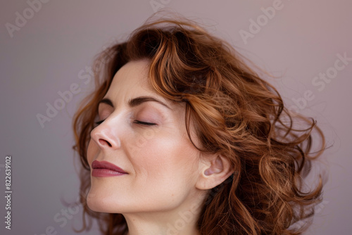 A close up of a woman's face with her eyes closed looking to a side