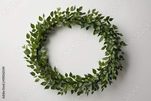 a close up of a wreath of green leaves on a white wall