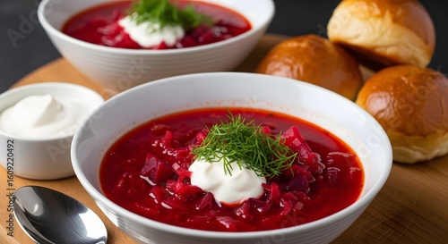 A close up of two bowls of borscht with sour cream and dill served with buns on a wooden board