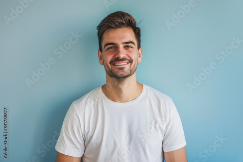 A close up portrait of a young man with a subtle smile
