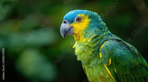 A close up profile of a vibrant blue and yellow parrot with green feathers and an orange eye