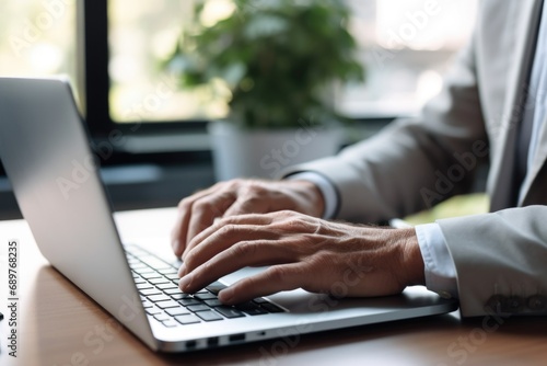 A close up shot of a person's hands typing on a laptop. This image can be used to represent technology, work, productivity, or online communication