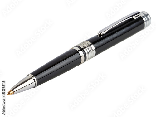 A close up shot of a sleek black pen with silver accents on a black background in a studio setting