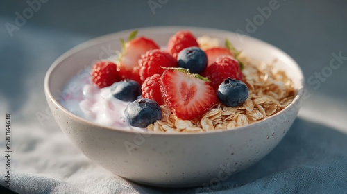 A close up view of a bowl of oatmeal topped with fresh strawberries blueberries and raspberries