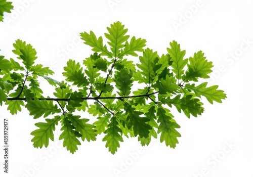 A close up view of an oak tree branch with green leaves against a white background sky outdoors
