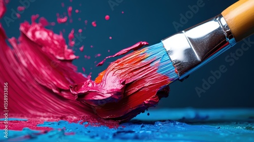A close view of a paintbrush creating colorful streaks of paint, showcasing vibrant splashes of pink and blue on a contrasting background for a visually striking effect.