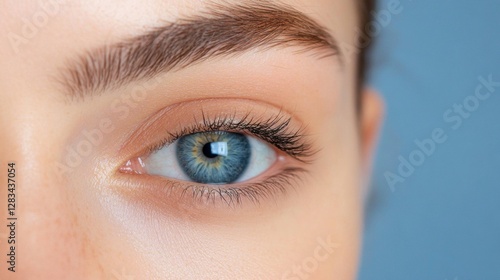 A close-up captures the enchanting blue eye and delicate features of a young caucasian female, radiating confidence and allure. The calm blue backdrop enhances her striking beauty