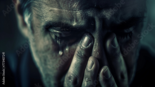 A close-up depicts a distressed man, his hands held to his face, overwhelmed by emotional turmoil and profound sadness.