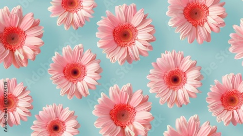 A close-up illustration of pink gerbera daisies arranged in a symmetrical pattern on a light blue background