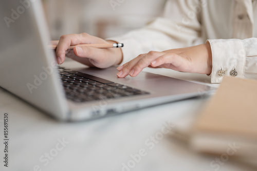 A close-up image of a businesswoman working on her laptop computer, typing on the laptop keyboard.