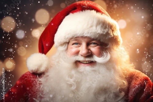 A close-up image of a person dressed in a Santa suit. This picture can be used for various holiday-themed designs and promotions