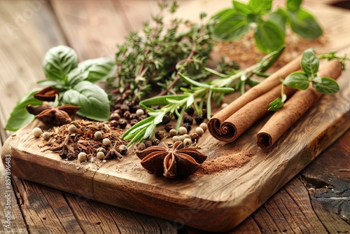 A close-up image of fresh and dried herbs and spices, including rosemary, thyme, basil, cinnamon sticks, star anise, and peppercorns, arranged on a wooden cutting board. Generative AI