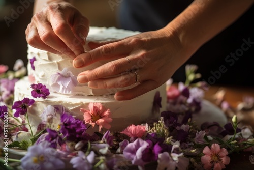 A close-up of a baker's hands carefully placing edible flowers on a wedding cake.