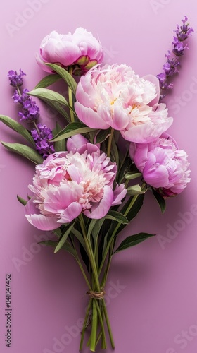 A close-up of a bouquet of pink peonies and lavender flowers arranged on a purple background
