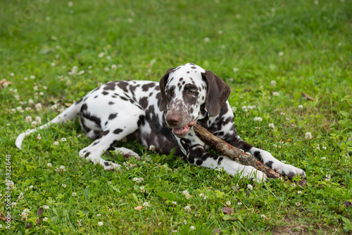 A closeup of a Brown dalmatian puppy biting stick on green grass. A dog on grass playing with and chewing a stick.Dog breed lying on the lawn biting a stick
