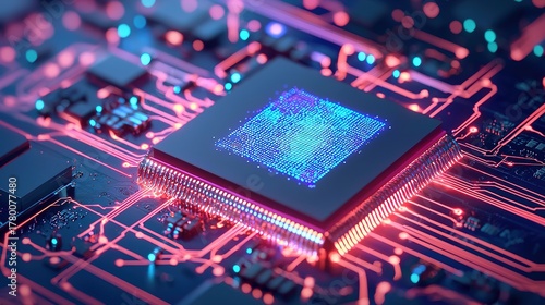 A close-up of a computer microchip on a circuit board, showcasing vibrant blue and pink lighting that highlights its intricate design and technology.