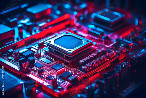 A close-up of a computer motherboard with red and blue lights, and computer graphics design.