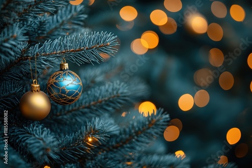 A close-up of a decorated Christmas tree with ornaments and warm bokeh lights in the background.