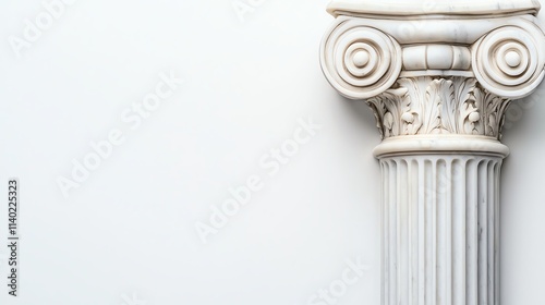 A close-up of a decorative white column showcasing intricate carvings and a classic design, set against a plain background.
