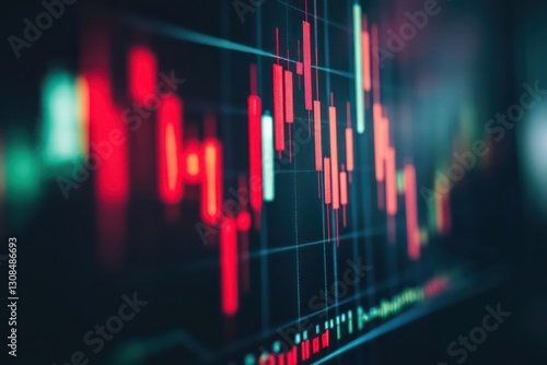 A close-up of a digital stock market graph showing fluctuating market trends, with a focus on red and green candlestick patterns.