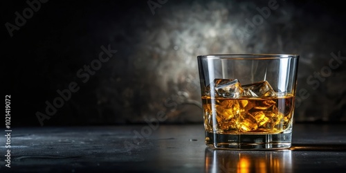 A close-up of a glass of whiskey with ice on a dark, textured background. The amber liquid shines with reflections of light, making the scene inviting and sophisticated.