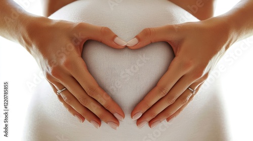A close-up of a mother-to-be’s hands forming a heart shape over her belly with soft, natural lighting.