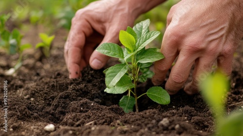 A close-up of a person hand patting down the soil around a newly planted tree, with the tender leaves and firm earth representing a connection to nature.
